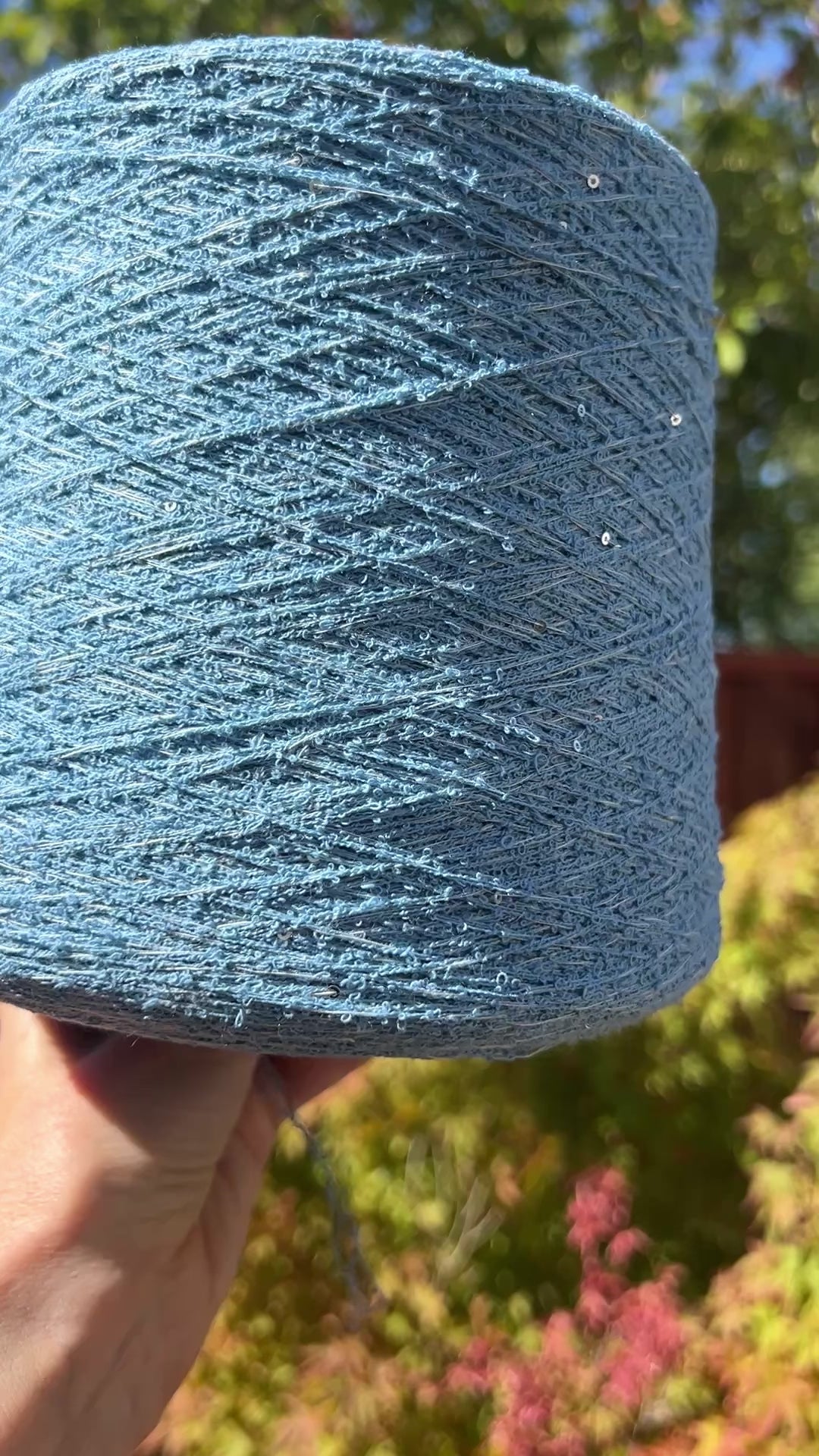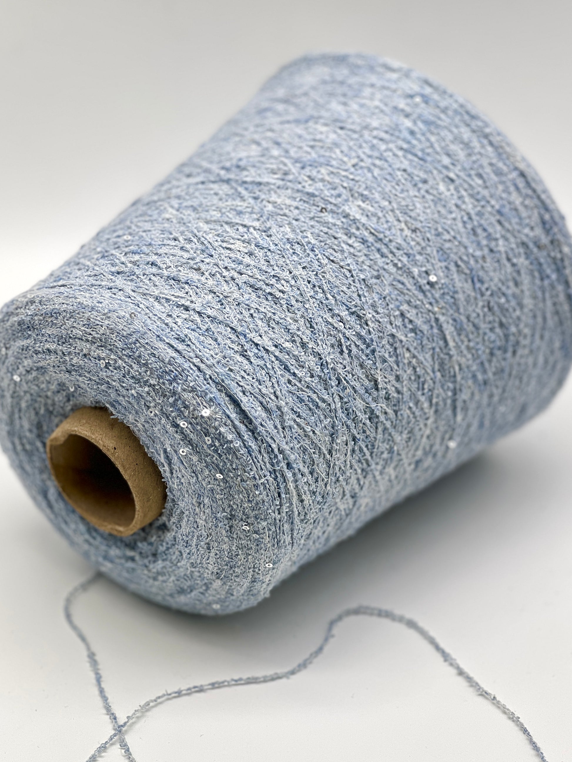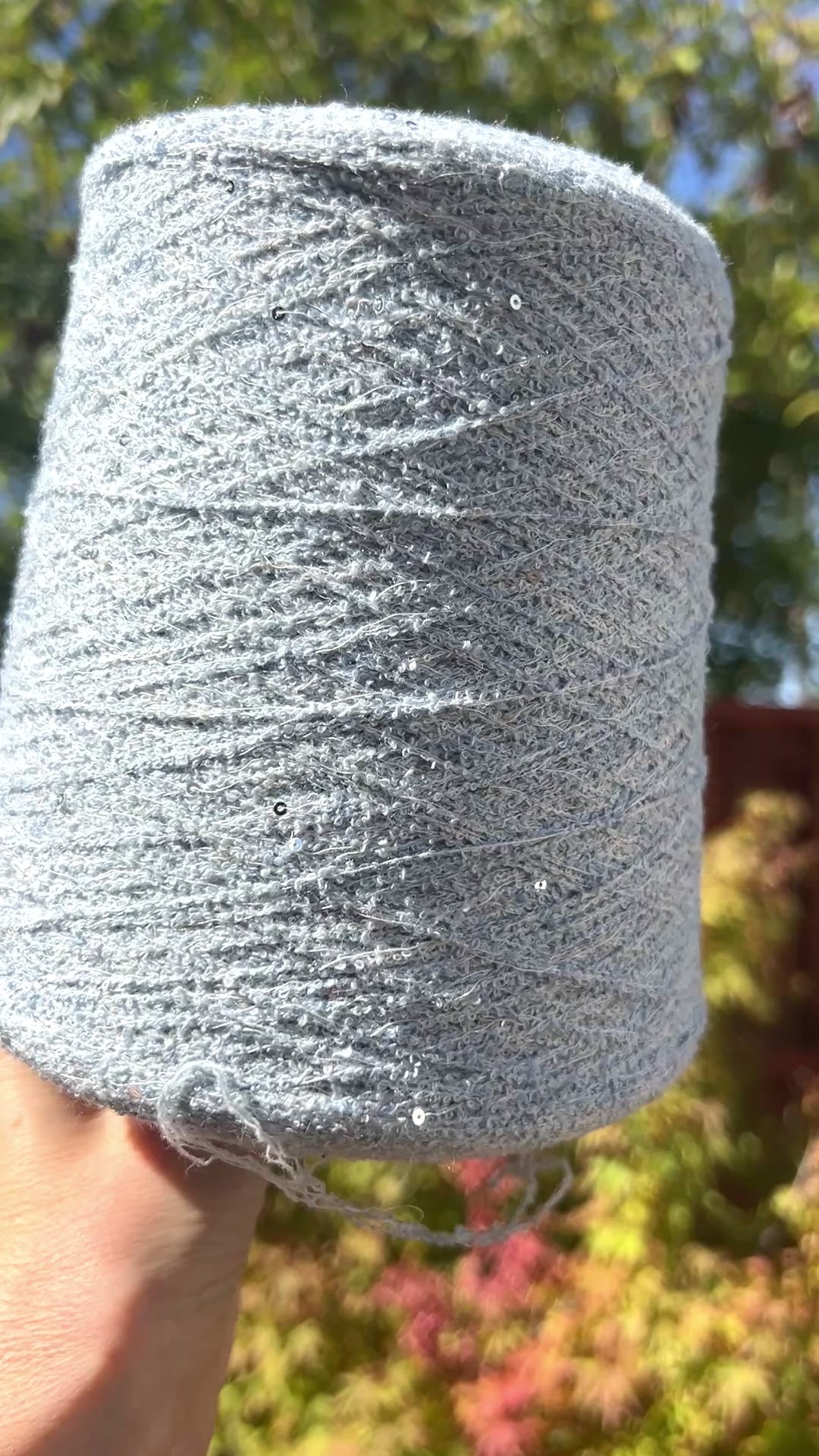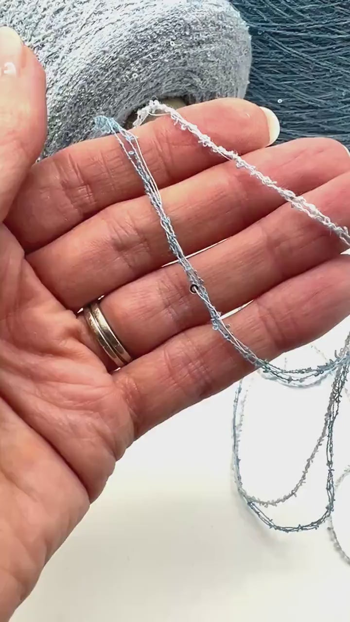 A delicate Italian yarn with a hint of sparkle – KIR by Lanificio Dell'Olivo is a lace-weight blend of 80% cotton and 20% nylon, enhanced with 2mm silver paillettes. The thread consists of three microbouclé cotton strands and one nylon strand with sequins spaced about every 15–16 inches (38–40 cm), creating a soft, breathable yarn with subtle shimmer.