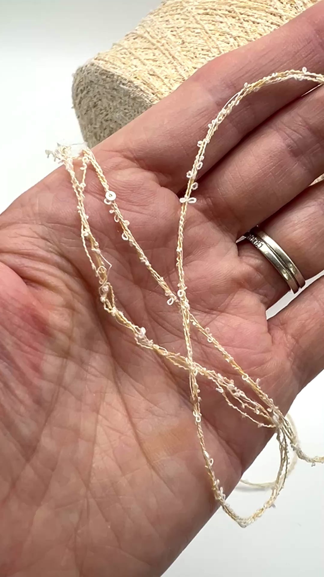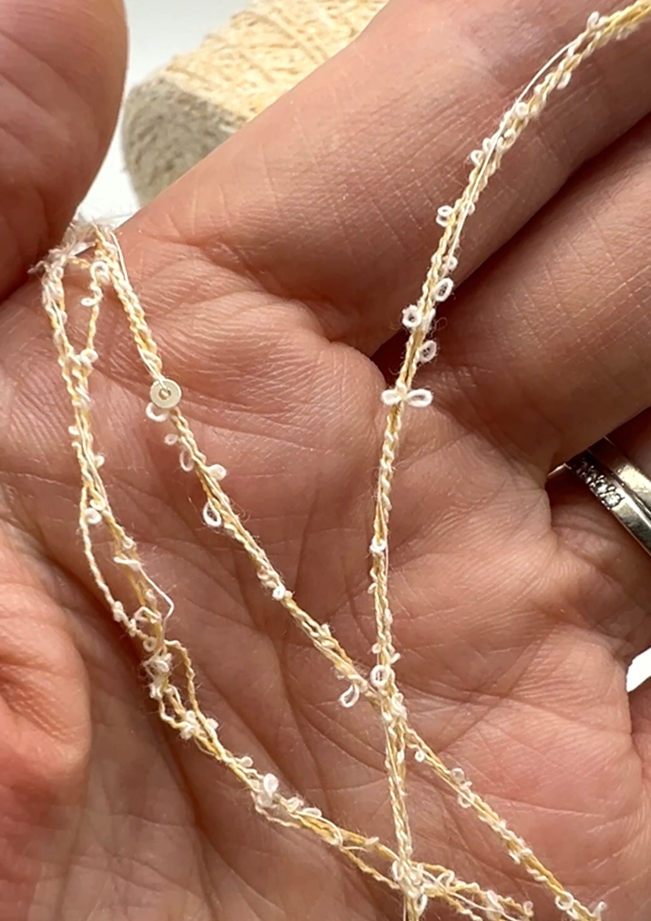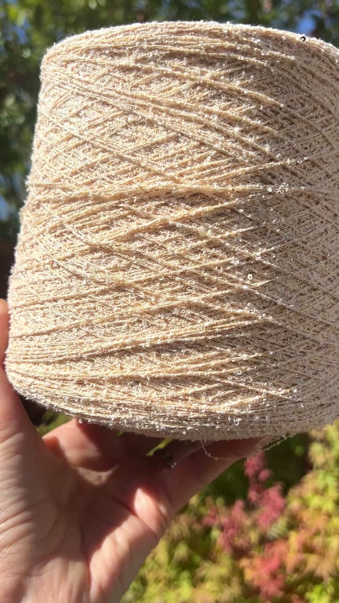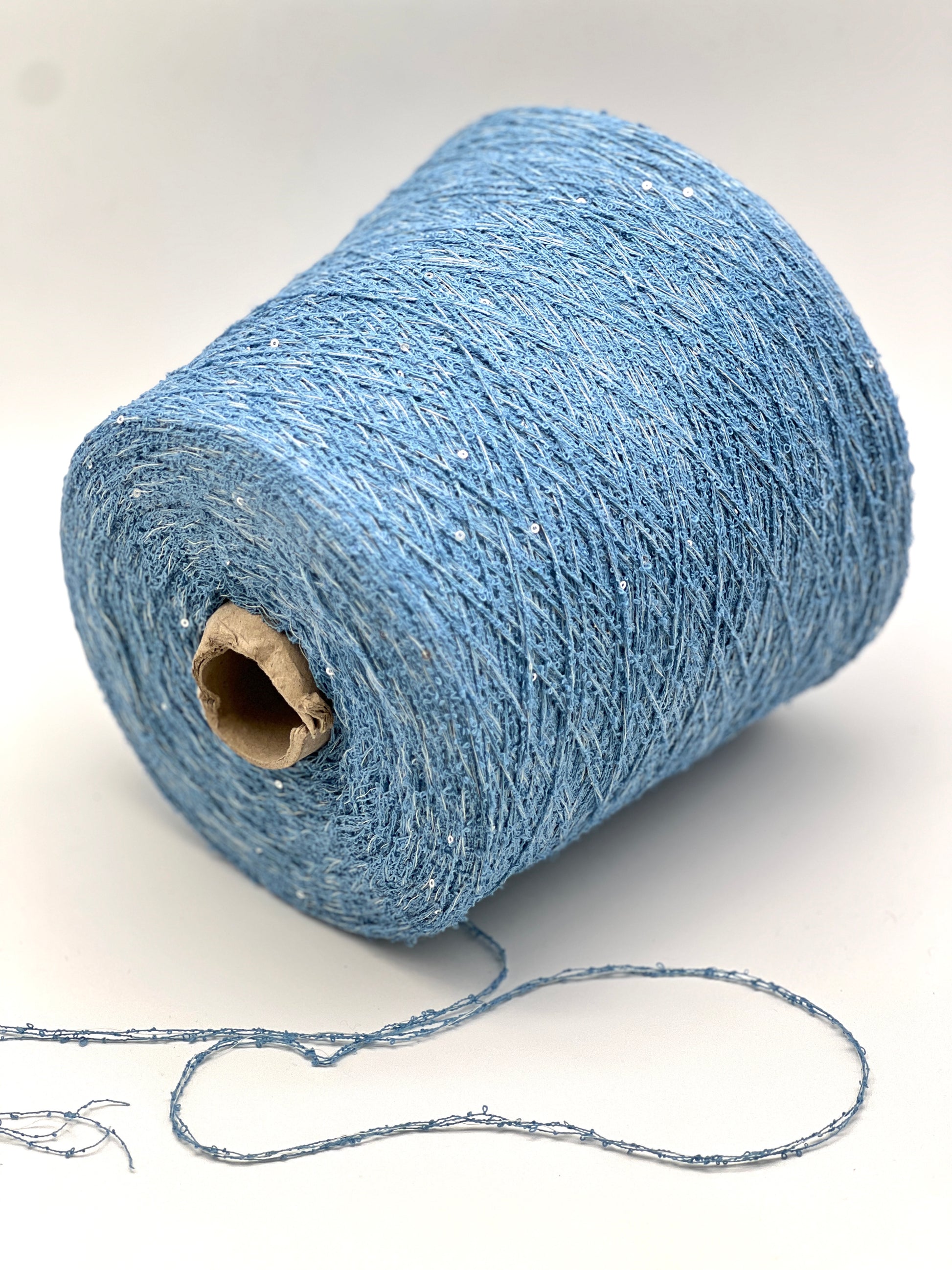 A delicate Italian yarn with a hint of sparkle – KIR by Lanificio Dell'Olivo is a lace-weight blend of 80% cotton and 20% nylon, enhanced with 2mm silver paillettes. The thread consists of three microbouclé cotton strands and one nylon strand with sequins spaced about every 15–16 inches (38–40 cm), creating a soft, breathable yarn with subtle shimmer.