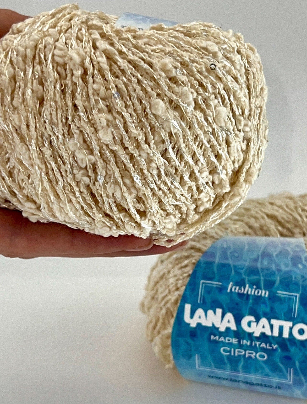 A designer CHANEL-style yarn with luminous sparkle and couture charm ✨ – Italian-made from 60% Cotton, 34% Polyester, and 6% Polyamide, CIPRO is part of the 2024 Fashion Line named after Mediterranean islands. This yarn features delicate micro-sequins that create a refined “Chanel” effect, offering elegant shine and texture for elevated warm-weather knits and accessories.