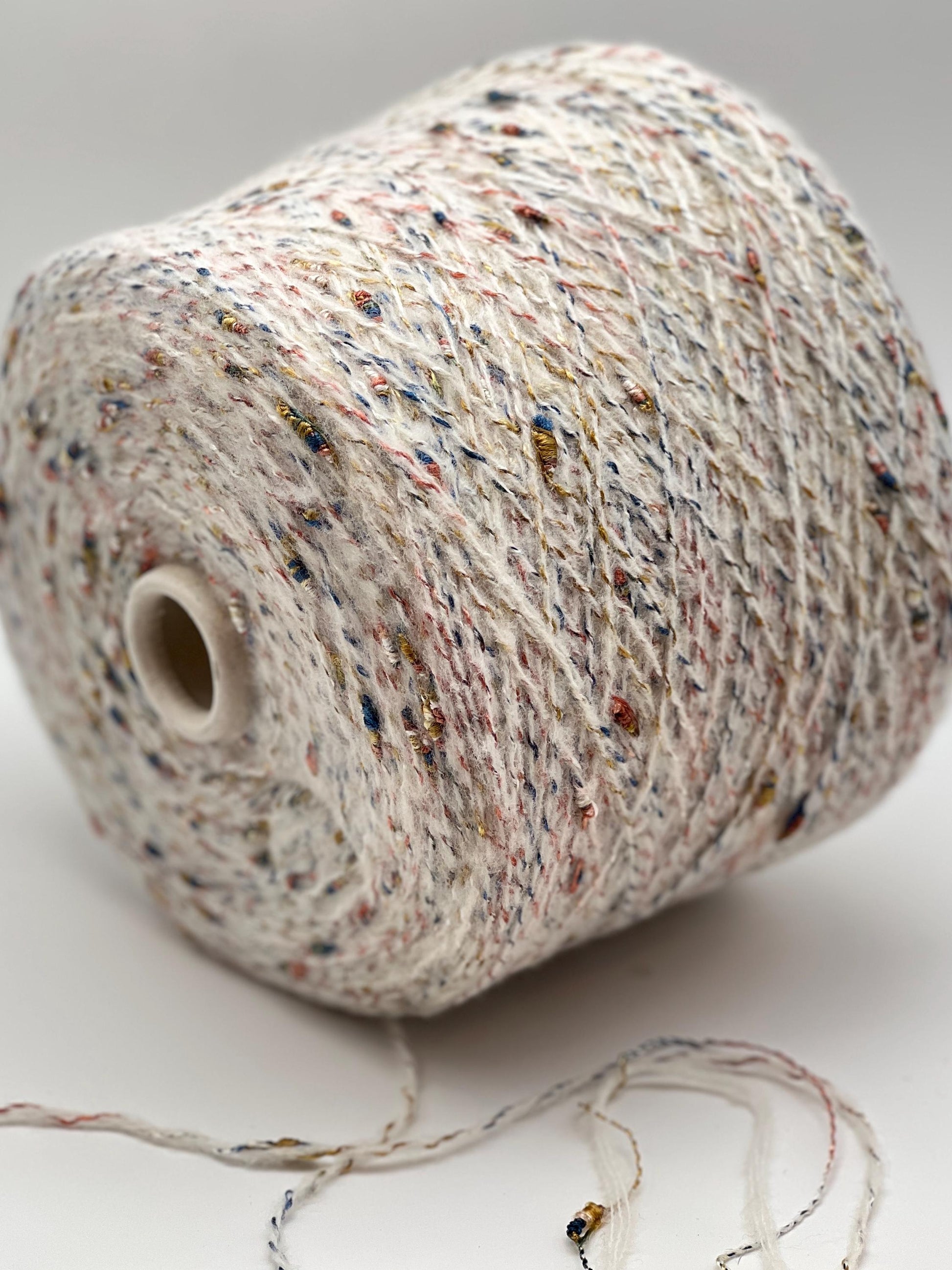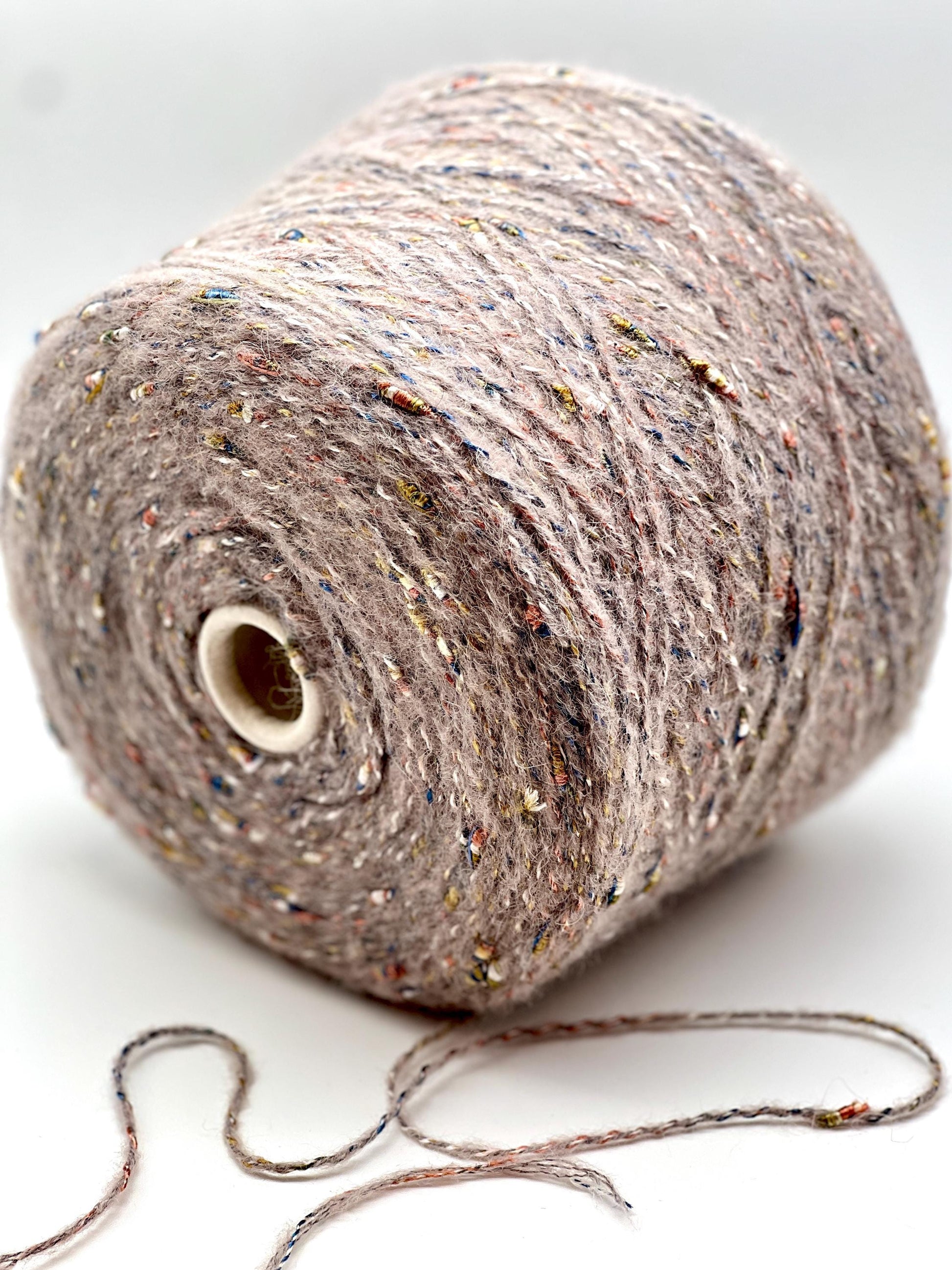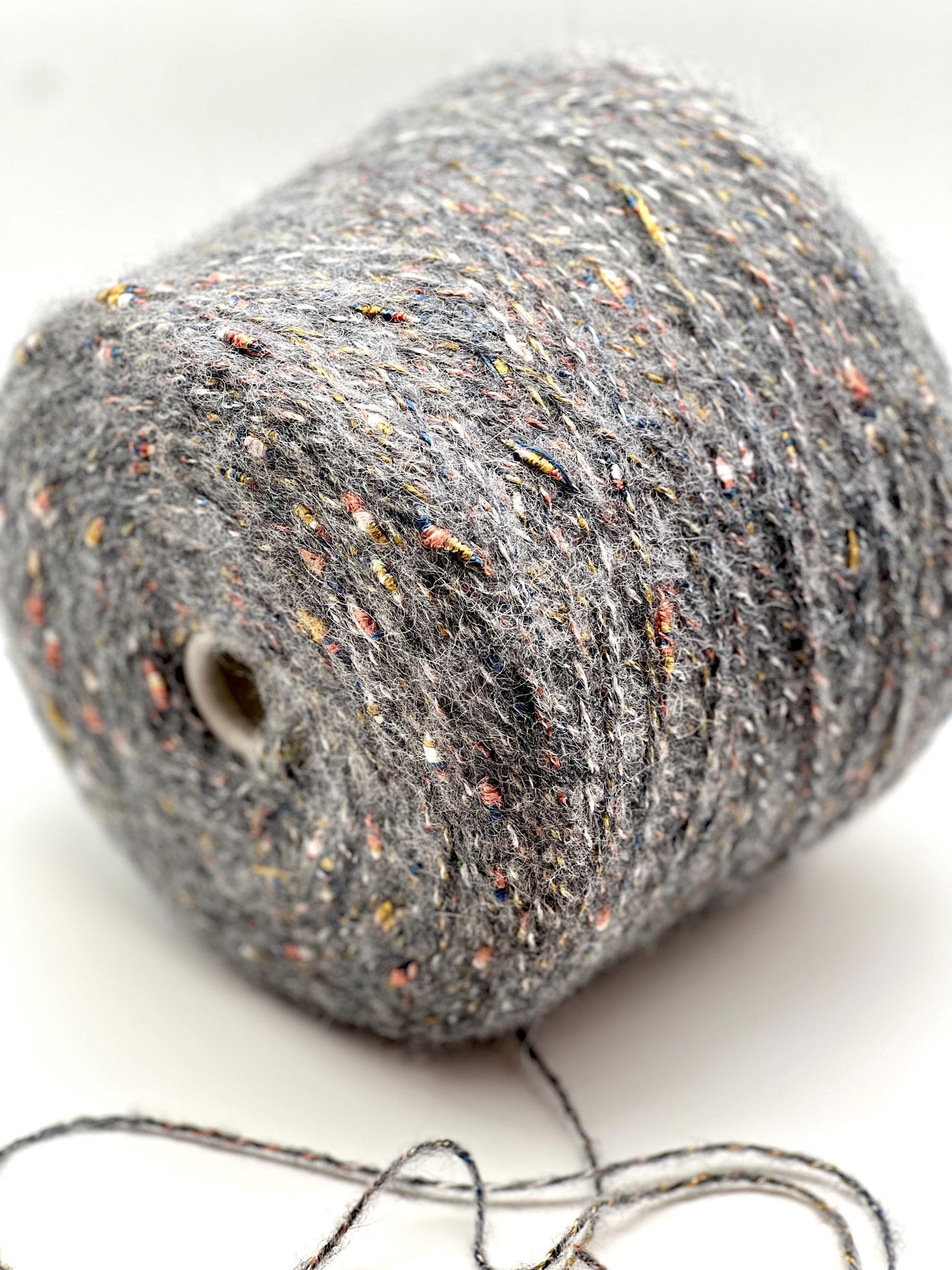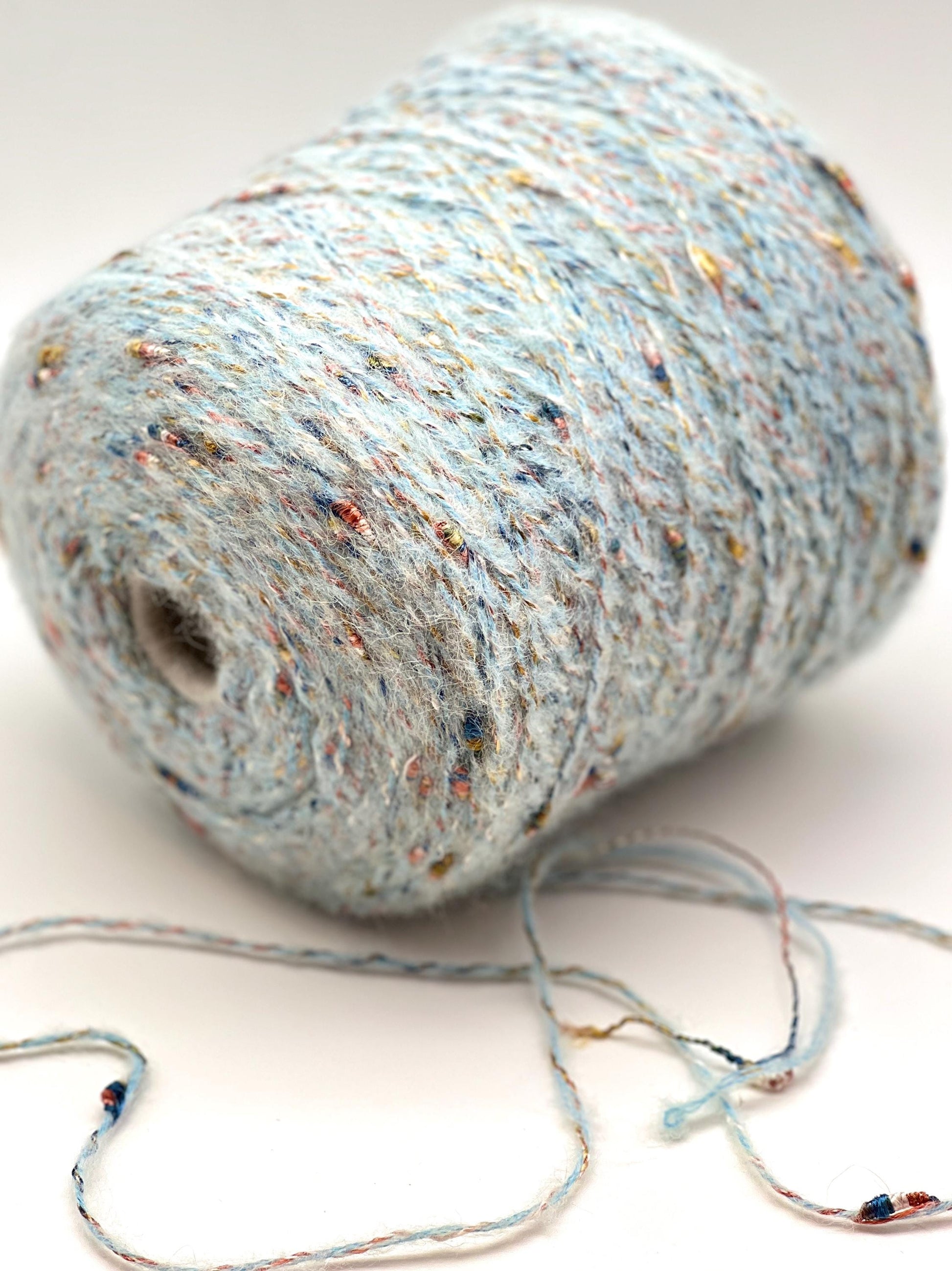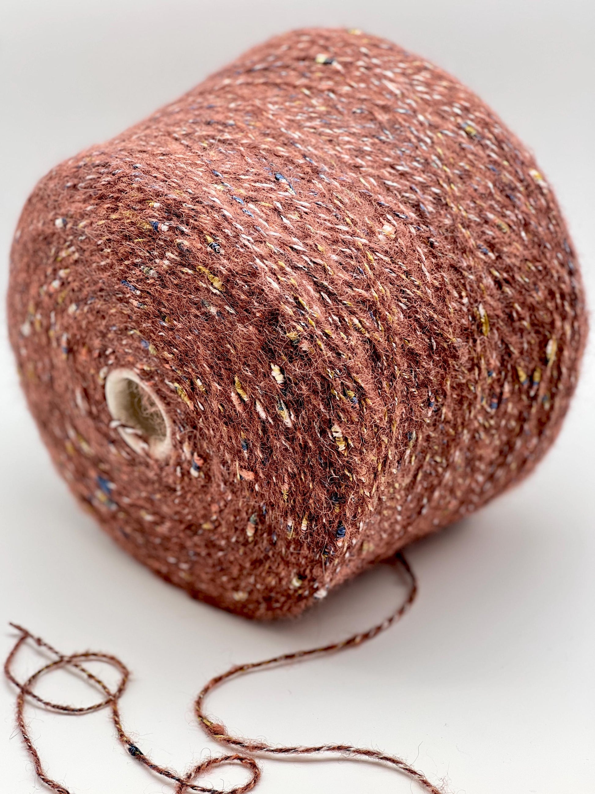 A rare luxury yarn with couture charm ✨ – TAURUS by RiGo, Italy, is a fluffy, soft base yarn spun from baby alpaca, wrapped with a multicolored shiny viscose thread, and accented with tiny boucle nubs (“shishibriki”). This aran-weight yarn offers a rich, textured surface and exceptional softness—perfect for Chanel-style knitwear or other statement pieces.