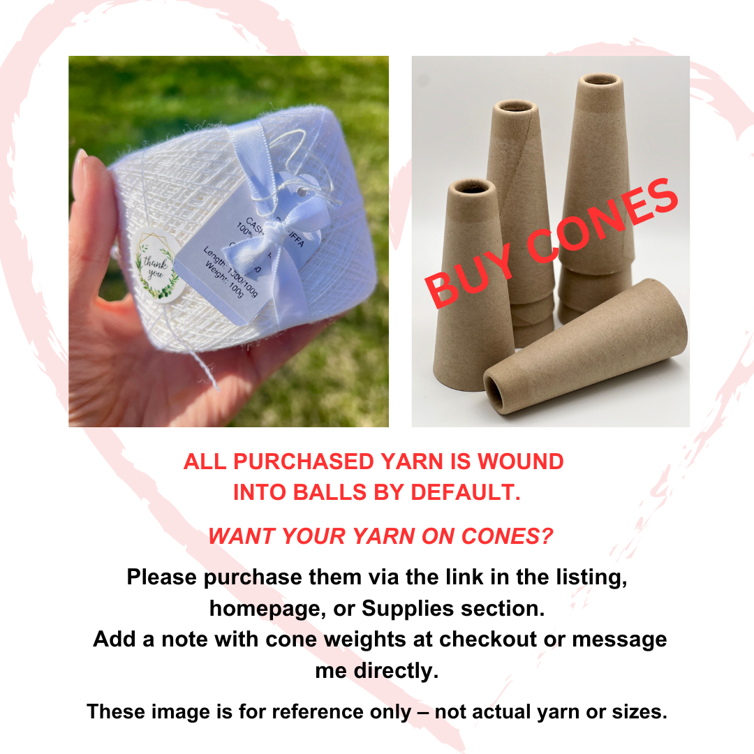 📌 Please keep in mind: cone yarns, especially those containing natural fibers, may include a protective coating used for industrial knitting. A few gentle washes may be needed to allow the yarn to fully bloom and soften.
