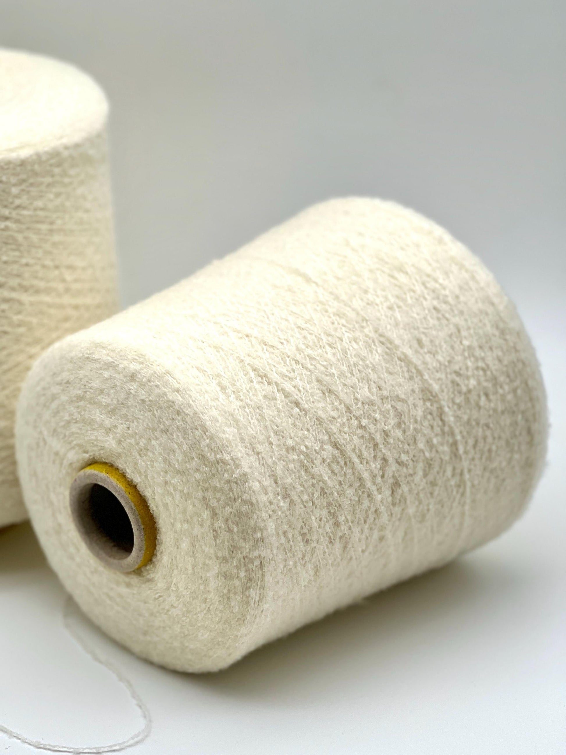 Due to its fineness, this yarn is generally used with multiple strands, or held together with a companion yarn, to create a wearable fabric. The bouclé structure is maximized after washing, where the fibers bloom to increase the halo and reveal the yarn's full, plush softness.