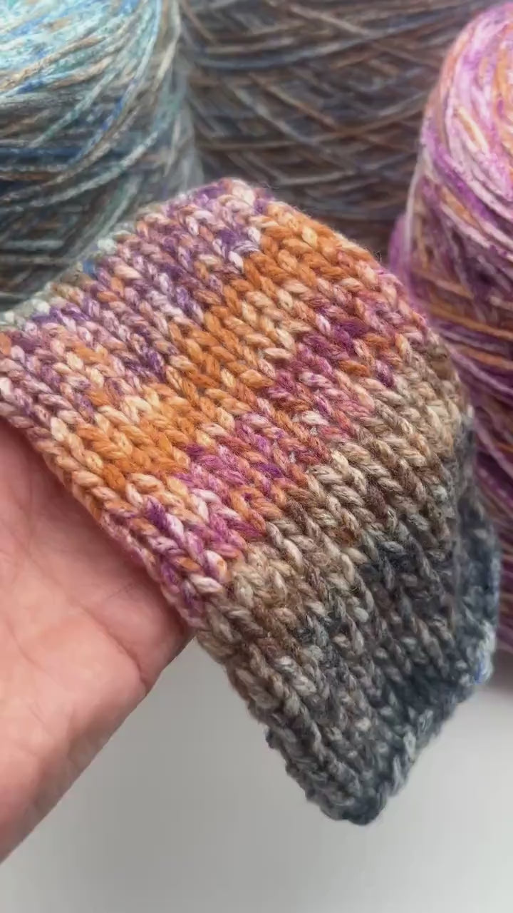 A cabled/corded yarn with a firm yet soft touch. The cabled structure gives it extra body and stitch definition, making it less prone to splitting and perfect for textured stitches, cables, and ribbing. Multicolor tones create subtle depth, while after washing the yarn blooms slightly with a gentle halo for a cozy finish.