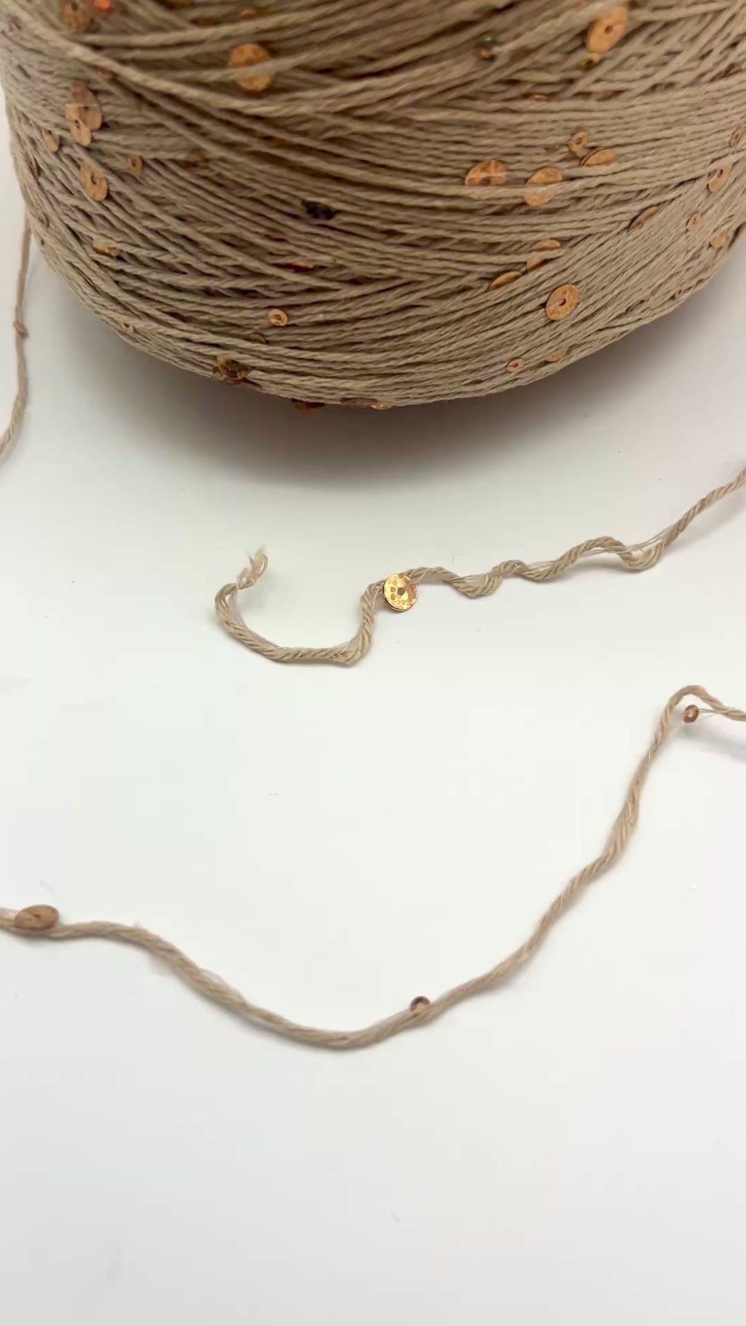 A rare couture yarn with luminous sparkle ✨ – STOCK BURBERRY, Italy, is a DK-weight 100% cotton yarn lavishly adorned with rainbow-gold paillettes in 3mm and 6mm sizes. Originally produced for the luxury fashion house Burberry, this yarn’s glamorous sequin detailing and soft cotton base make it perfect for statement garments and accessories.