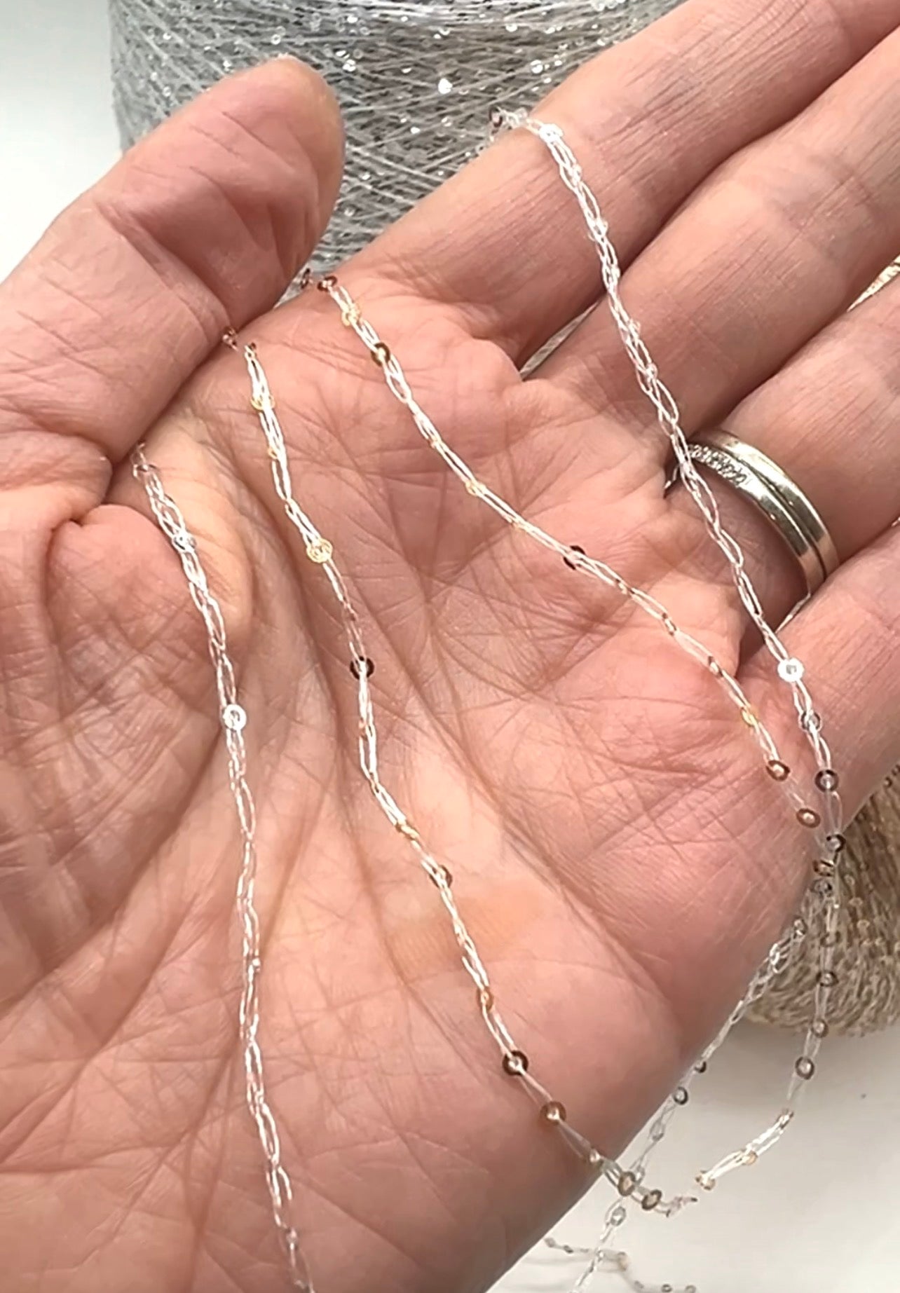 A refined Italian sequin yarn designed to bring delicate brilliance and modern elegance to your knitwear. Crafted by Cofil (Italy), this lace-weight SEQUINS features a smooth polyester base adorned with fine micro-paillettes that reflect light with a clean, luminous shine. Despite being a sequin yarn, it is very soft, flexible, and comfortable to work with — suitable both as a standalone yarn and as a companion thread.