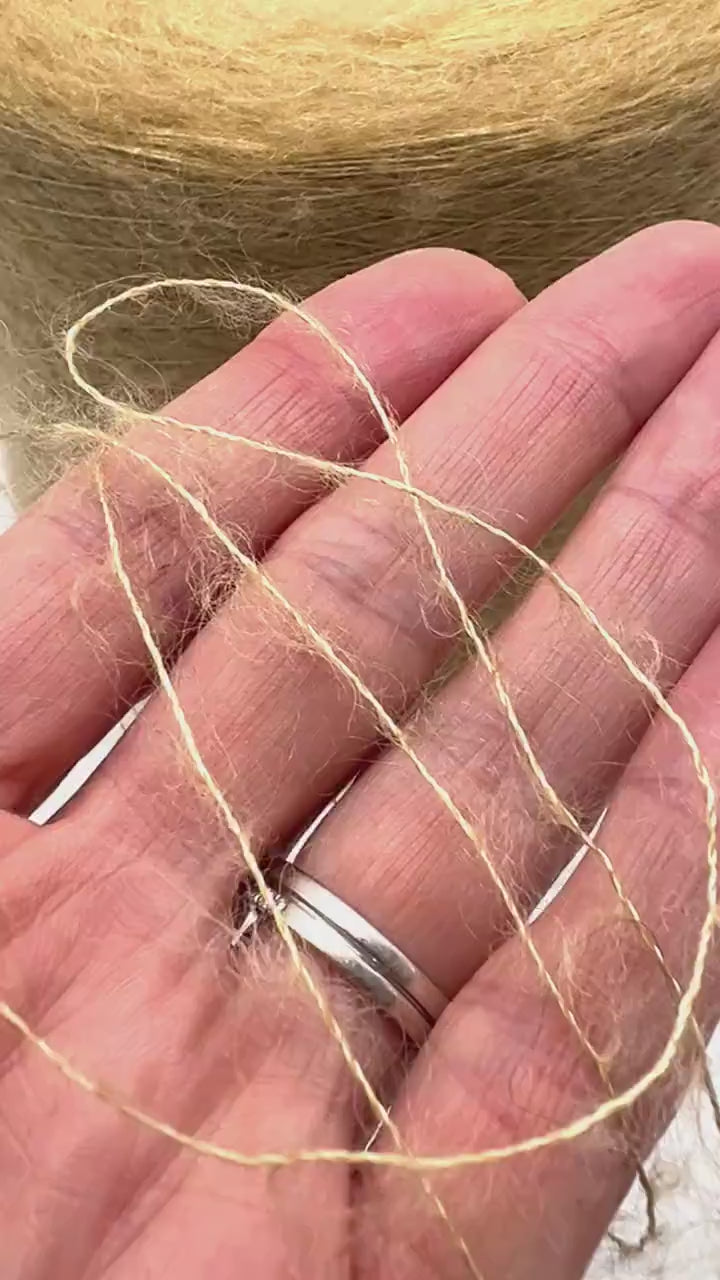 Experience the whisper-soft touch of this ethereal yarn, a luxurious blend of exceptionally fine Superkid Mohair in a rich camel beige. Spun on a luminous brushed gold silk thread, the yarn radiates a subtle, golden glow that catches the light and adds a sophisticated depth to its color. It transforms effortlessly into a lightweight, airy fabric with a delicate halo and a beautiful drape, creating a garment of unparalleled elegance and warmth. This is more than just yarn; it’s an invitation to create something timelessly classy and extraordinary.
