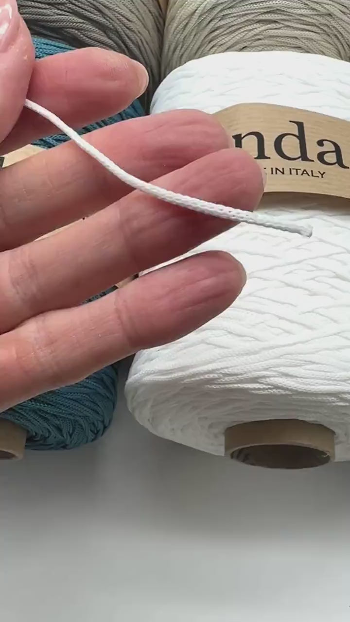 It’s a round, cord-like yarn — not flat ribbon — and is considered structured but lightweight. This thickness works well with 3.0 mm to 4.0 mm crochet hooks or knitting needles and falls roughly into the DK to Worsted range, depending on the tension and technique used.