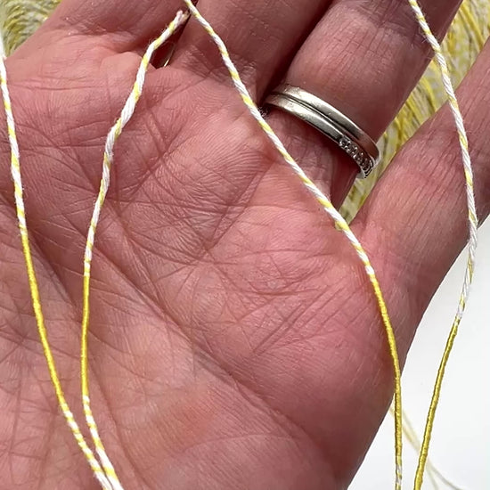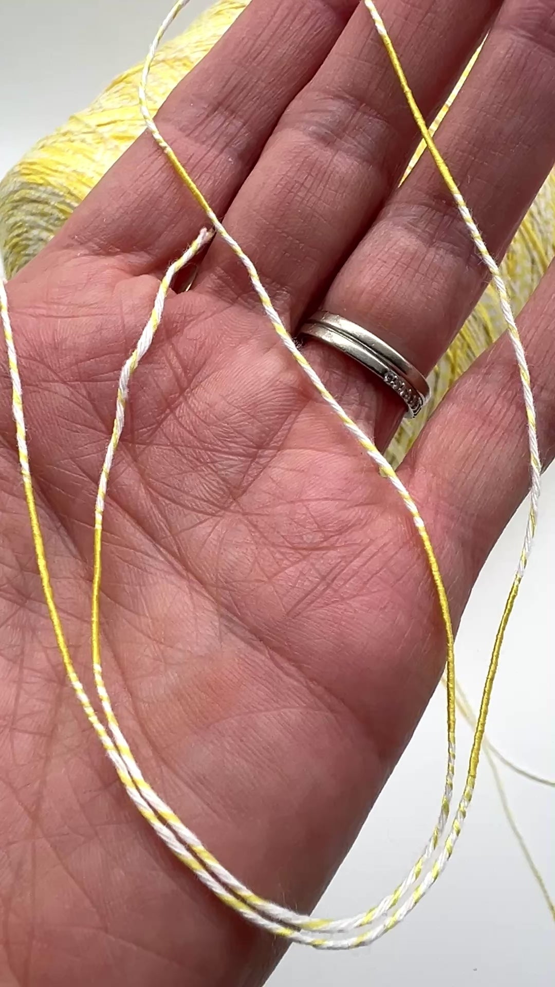 A rare Italian yarn with artisanal charm ✨ – CACCIUCCO by New Mill, Italy is a unique DK-weight yarn where two strands of soft white cotton are wrapped with a single blue polyamide thread in an uneven rhythm. At regular intervals, the blue thread winds loosely, and then about every inch it tightens dramatically, forming small cocoon-like clusters.