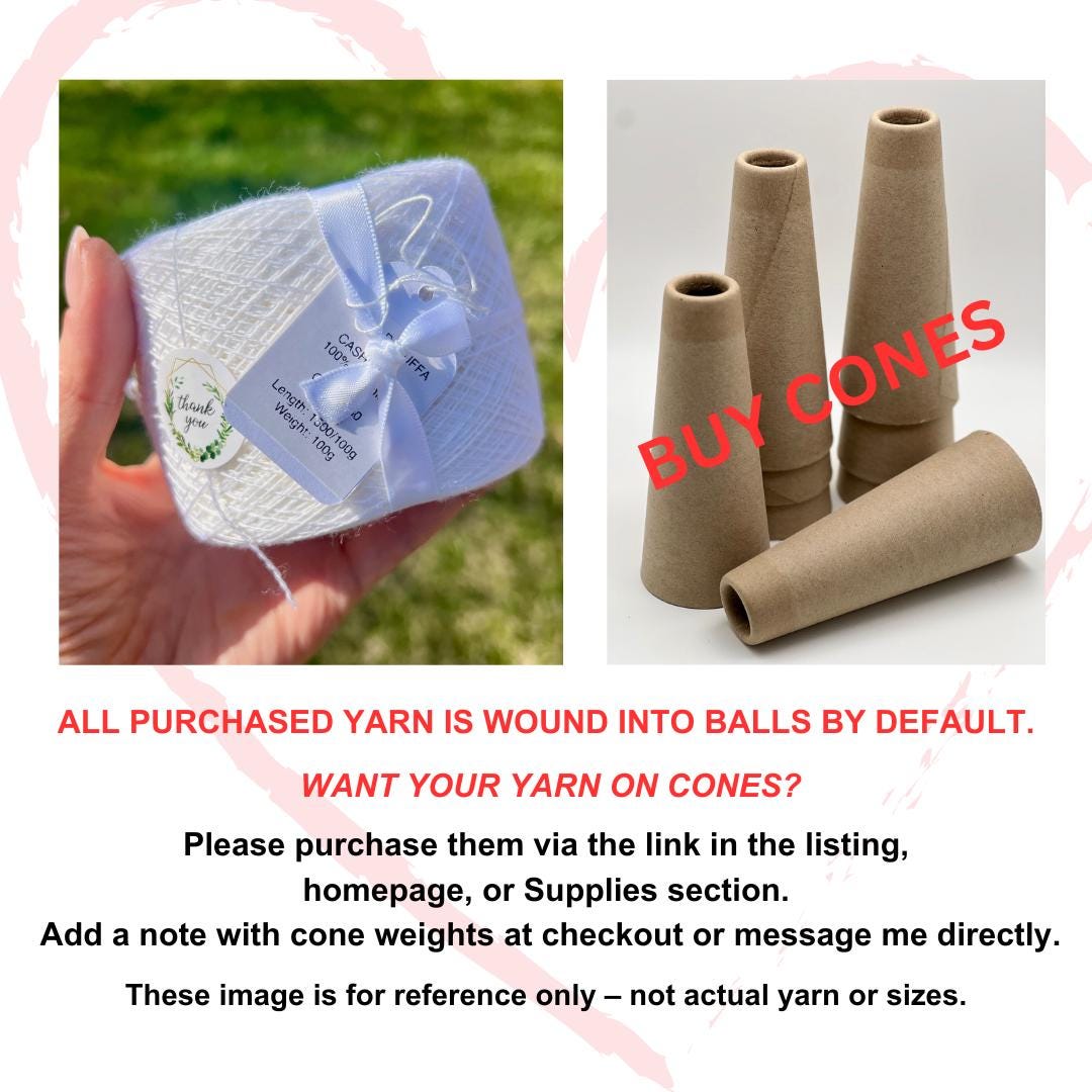 The amount of yarn shown on cones in the photos may not reflect the actual quantity you’ll receive. Yarn is custom-wound per your order.